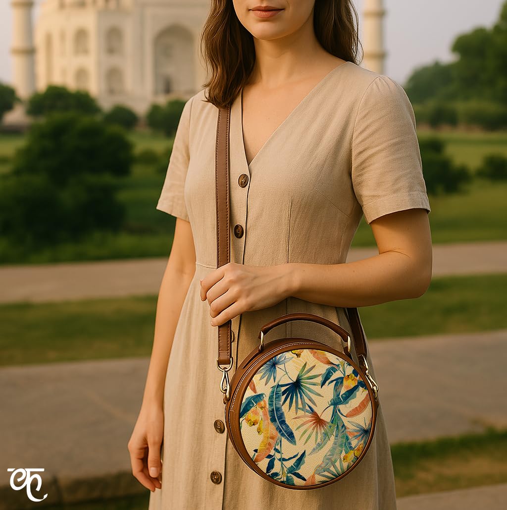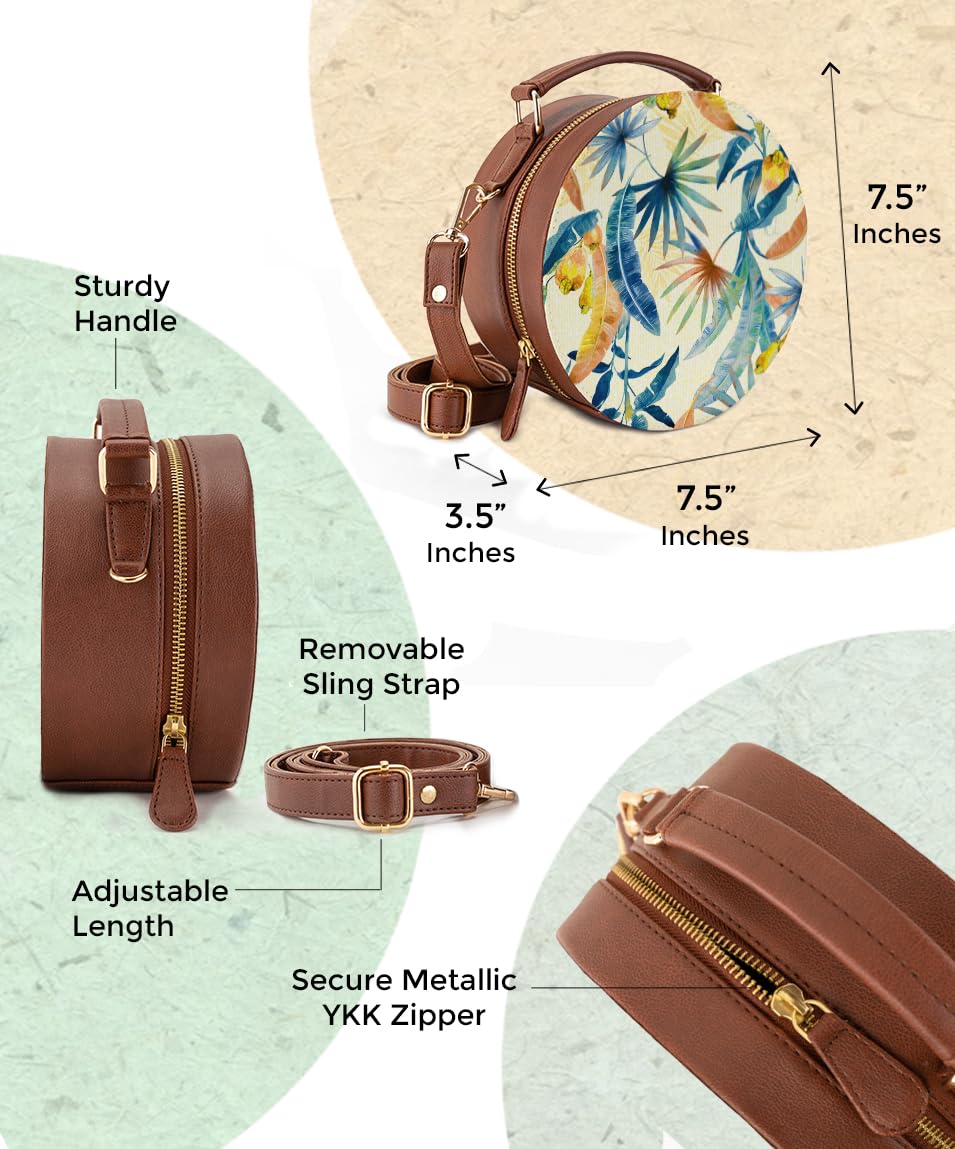 The Kalānkit Crossbody Round Sling Bag for women features a metallic zipper closure, ensuring the safety and security of your belongings. This chic round box sling bag features a robust handle that ensures a comfortable and secure grip, making it effortless to carry with confidence.