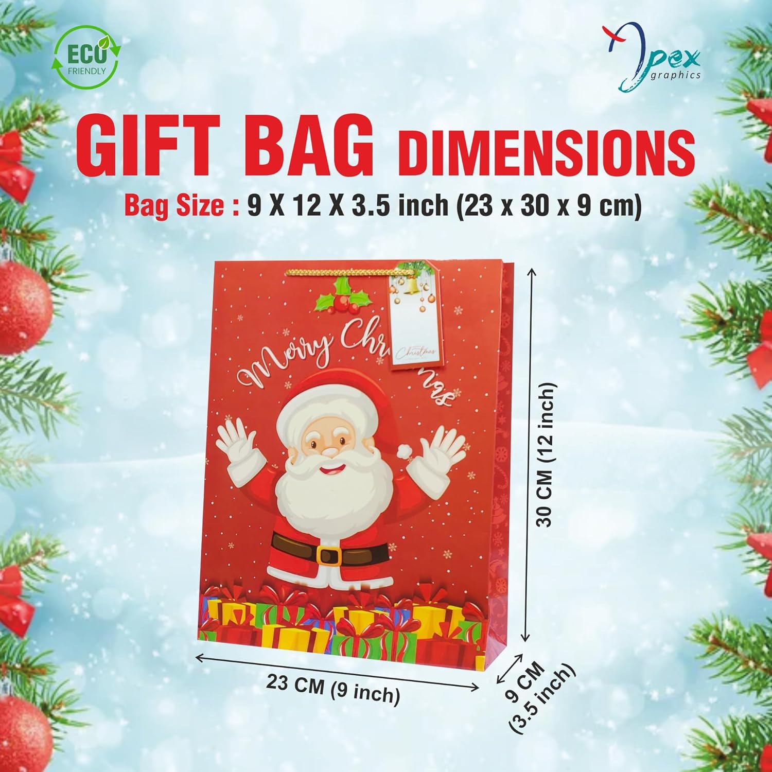 Celebrate the joy of gifting this season with Apex Graphics Christmas Paper Bags the perfect way to wrap your presents in style! These Medium Size Gift Bags (Pack of 10) are beautifully designed with a Santa Claus theme, making them ideal for Christmas celebrations, parties, and festive gifting. Each Christmas Gift Bag is crafted from premium-quality, durable paper that ensures strength and reliability. With dimensions of 23 x 30 x 9 cm (9 x 12 x 3.5 inch), these Medium Size Paper Bags offer plenty of space for chocolates, candles, toys, or return gifts. π Elegant & Festive Design Featuring charming **Christmas prints** and cheerful holiday colors, these **Paper Bags for Gifting** bring warmth and joy to every celebration. The strong golden rope handles make them easy to carry, while the glossy finish adds a premium touch that enhances your gift presentation. β¨ Perfect for Every Occasion Whether youβre packing return gifts for kids, giving festive treats, or sending corporate presents, these Carry Bags for Gifting make every moment special. Theyβre also great for Paper Bags for Return Gift ideas at Christmas parties, office events, or family celebrations. Add festive cheer to your gifts this holiday season with Apex Graphics Christmas Gift Bags a perfect blend of beauty, quality, and convenience.