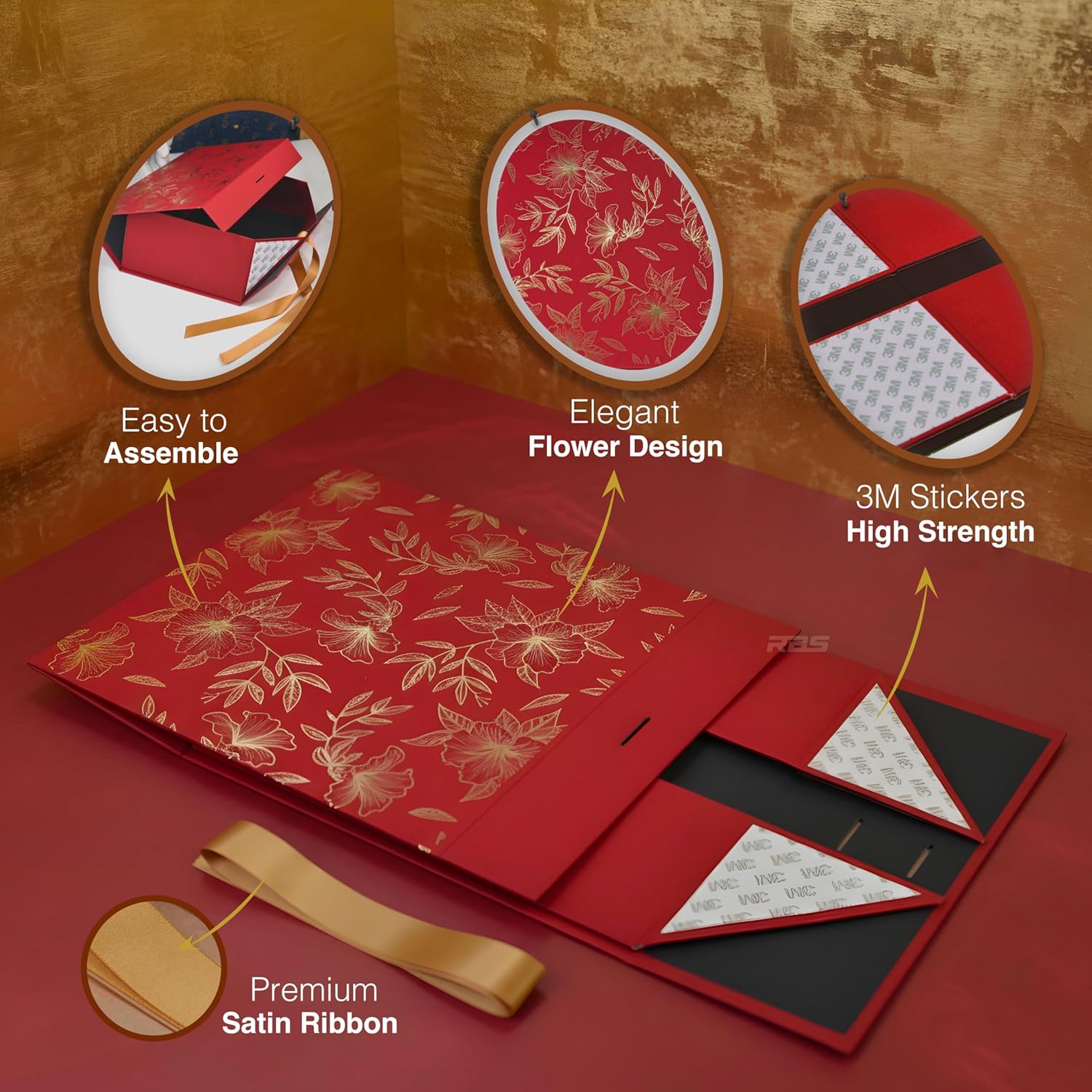 ✅ ELEGANT DESIGN – Features a stunning gold floral design on a dark scarlet background, giving a premium look to your hampers. Perfect for boxes for gifting during weddings, birthdays, anniversaries, festivals, or corporate events, leaving a lasting impression on recipients.