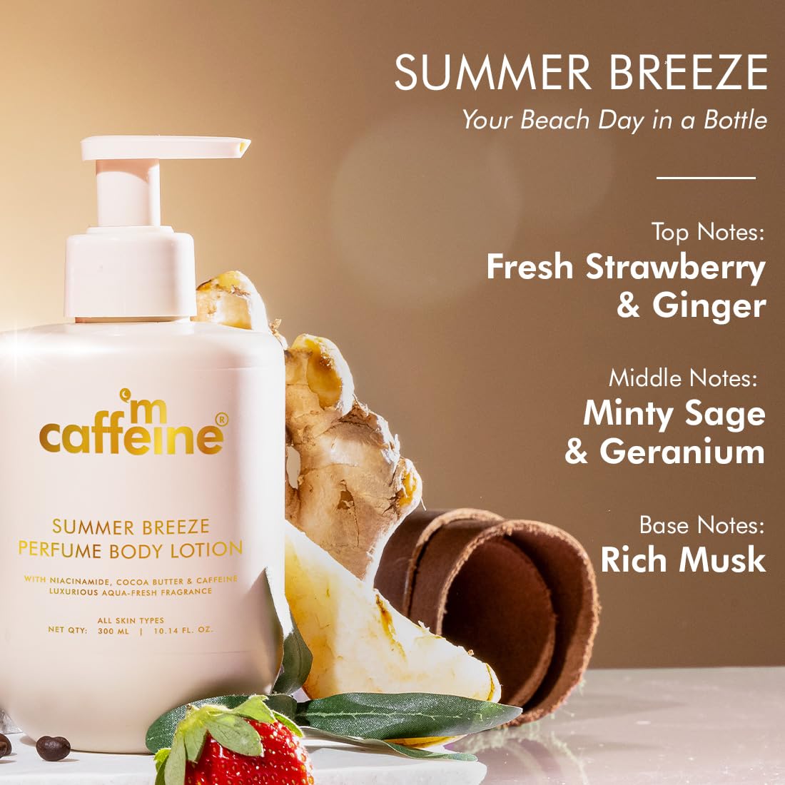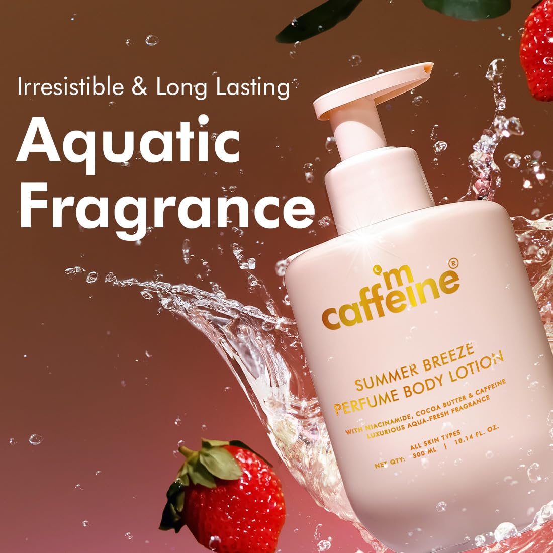 Lightweight 2-in-1 perfume-infused body lotions with Niacinamide, Cocoa Butter, and Shea Butter. These body lotions give 72 Hrs Deep moisturization, even skin tone, and prevent moisture loss. Sweet Escape has sweet & floral notes, whereas Summer Breeze has fresh & aquatic notes that keeps you smelling heavenly all day! 72 Hrs Moisturization* Cocoa butter deeply hydrates while Shea butter nourishes & moisturizes the skin making it soft, smooth & supple. It also promotes a healthy, radiant glow. *based on the Clinical Study, Aug 2025 Evens Skin Tone The mix of Niacinamide & Caffeine improves the skin’s barrier function & elasticity to promote healthy, even-toned skin. Lightweight & Non-Sticky 97% users agreed it is non-sticky, fast absorbing and lightweight. *Independent consumer feedback from 30 people after first product application