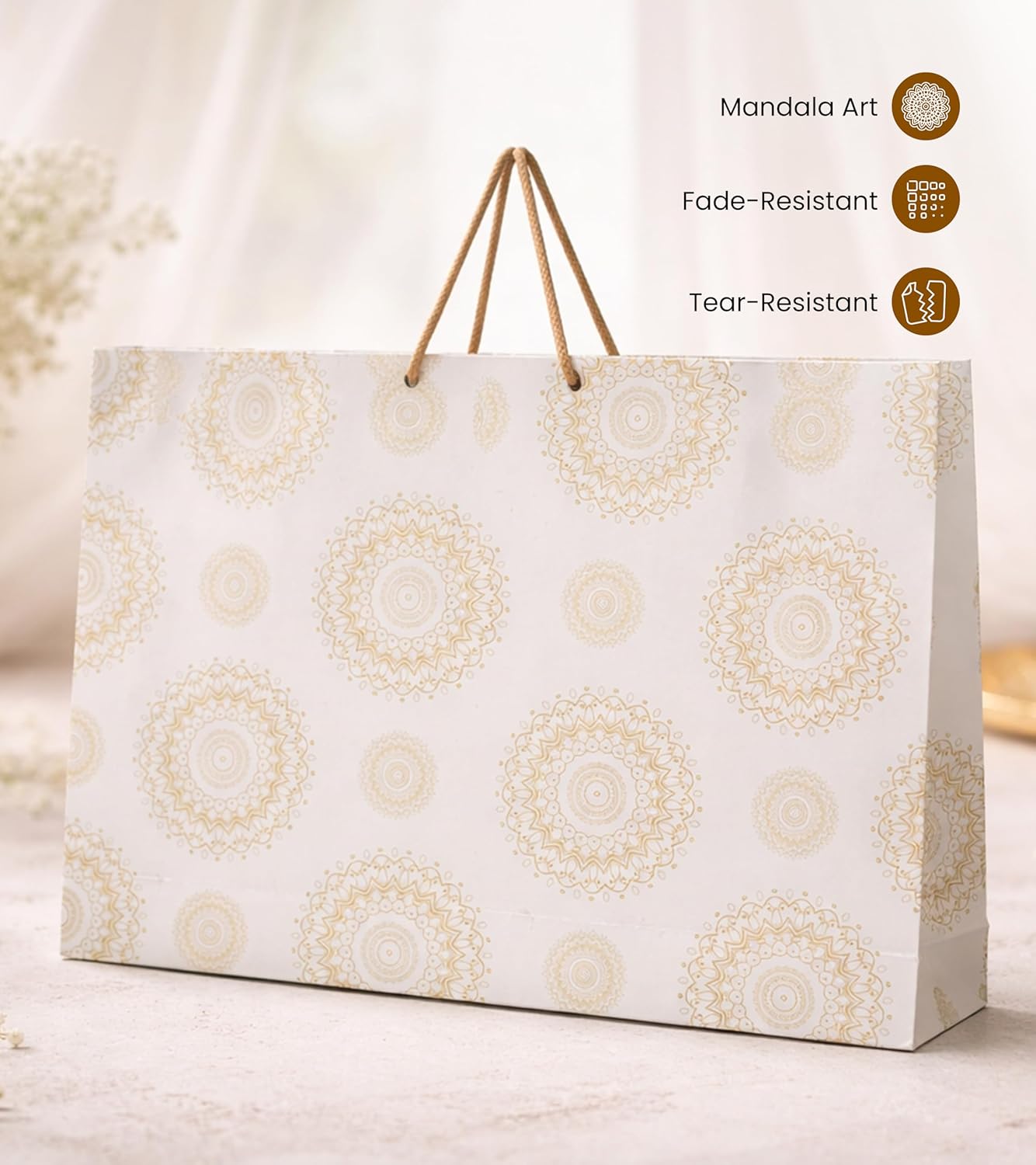 Gold Mandala Design → Featuring an elegant gold mandala printed pattern, these designer paper bags add a refined and traditional touch to gift presentation. Ideal for customers who prefer tasteful paper gift bags for weddings, festivals, and formal occasions where presentation matters without overwhelming the gift.