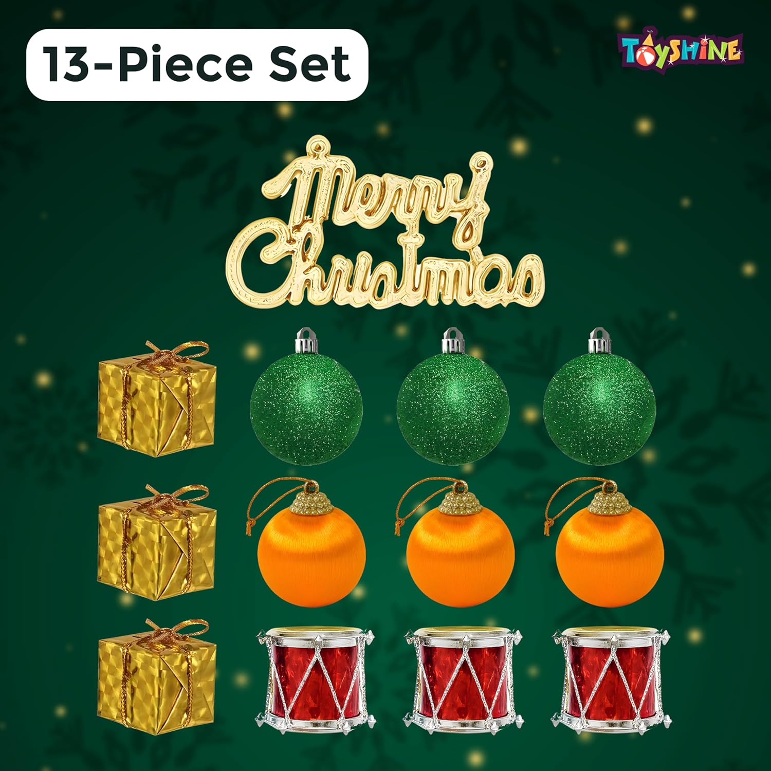 🎄 Complete 13 Pc Decoration Set – Includes colorful hanging balls, shiny mini drums, gift boxes, and a sparkling “Merry Christmas” sign for the perfect holiday décor setup.