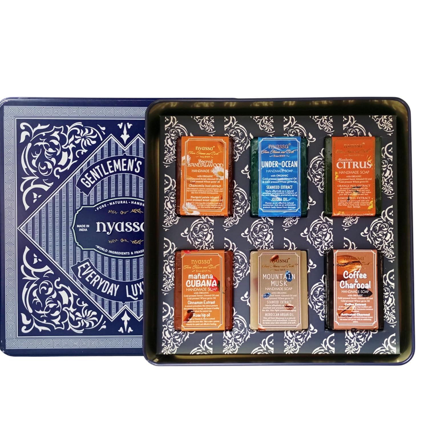 The set features Coffee and Charcoal handmade soap, Sacred Sandalwood handmade soap, Manana Cubana handmade soap, Mountain Musk handmade soap, Mandarin Citrus handmade soap, Under the Ocean handmade soap 75gm.This exclusive range of Six handmade bath soaps in this gift set has been fortified with natural ingredients that offer complete care to the rugged masculine skin.