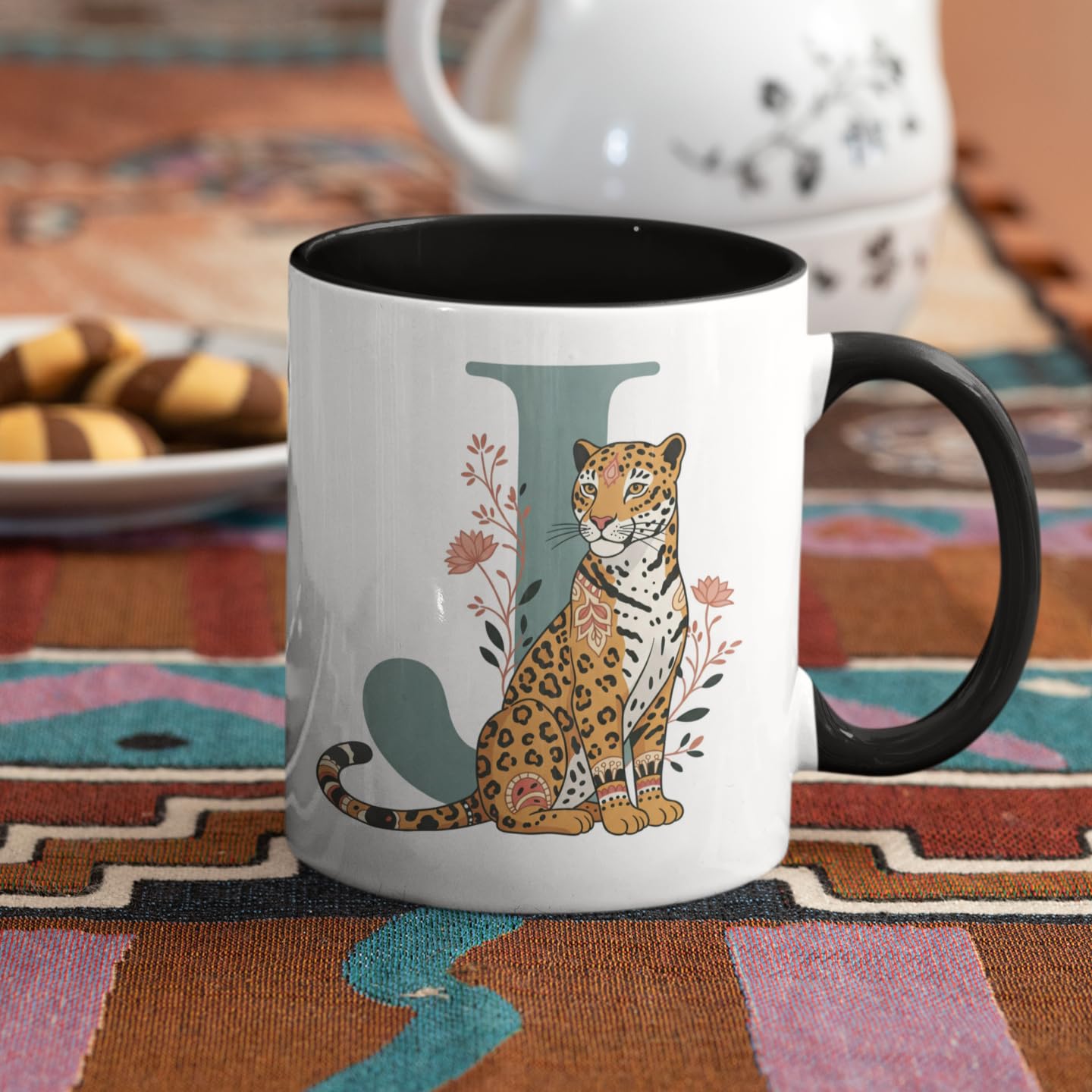 🐆 Personalized Alphabet Mug: Stylish Letter J mug featuring a beautifully illustrated jaguar surrounded by floral elements—perfect for those whose names start with J.