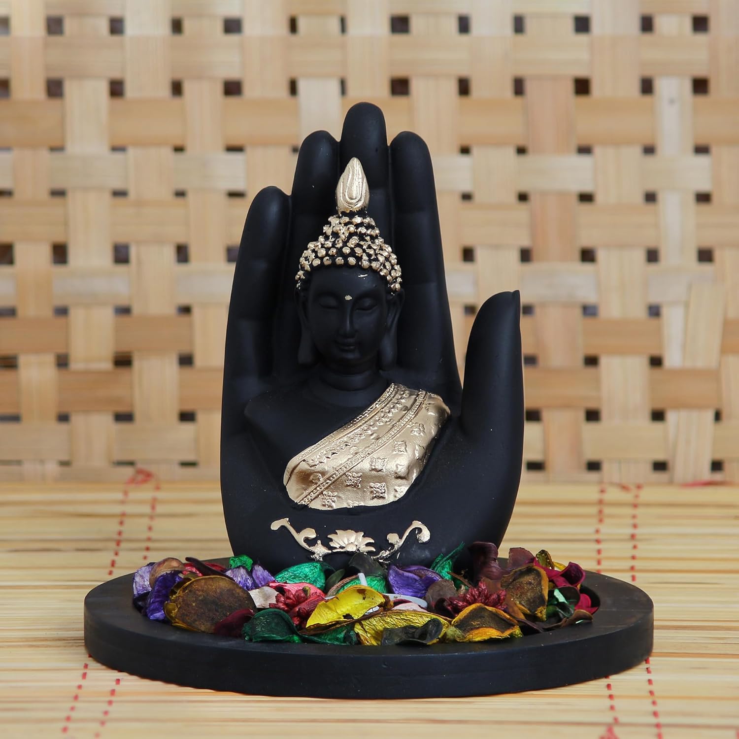 Package Content – One Golden Handcrafted Palm Buddha Decorative Showpiece with Wooden Base, Fragranced Petals and Tealight