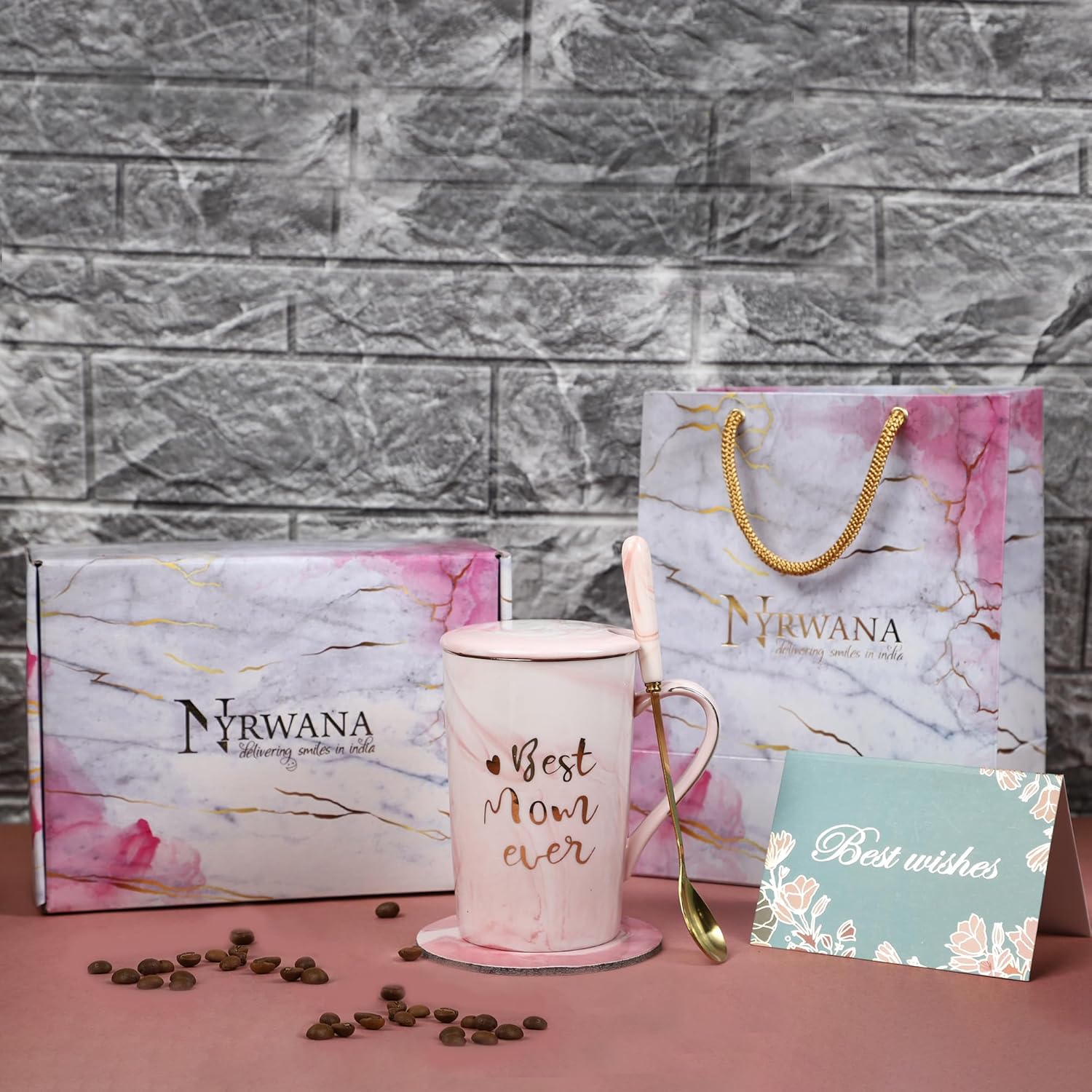 Package included: 1×Marbled mug, 1×gold spoon, 1×Lid, 1xBest Wishes Card, 1×Exquisite gift box