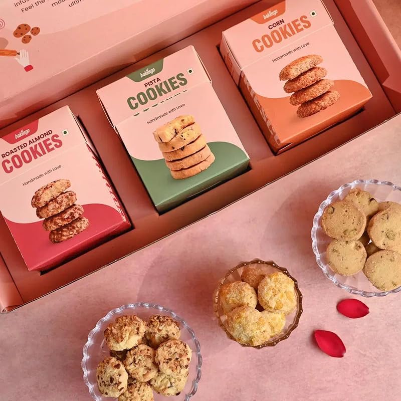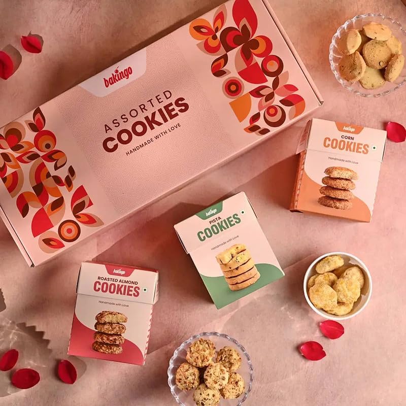 Delight your loved ones with the Bakingo Premium Gift Hamper, a luxurious assortment of 3 signature cookies – Corn, Pista, and Almond. Expertly baked to perfection, each cookie bursts with authentic flavor, rich aroma, and a delightful crunch. Thoughtfully packed in a premium gift box, this elegant hamper makes the perfect birthday gift, anniversary surprise, festive present, or corporate giveaway. Crafted using high-quality ingredients and baked fresh to preserve taste and texture, these cookies are a blend of tradition and indulgence — ideal for those who appreciate gourmet treats. With its classy packaging and irresistible taste, this hamper from Bakingo adds sweetness and sophistication to every occasion.