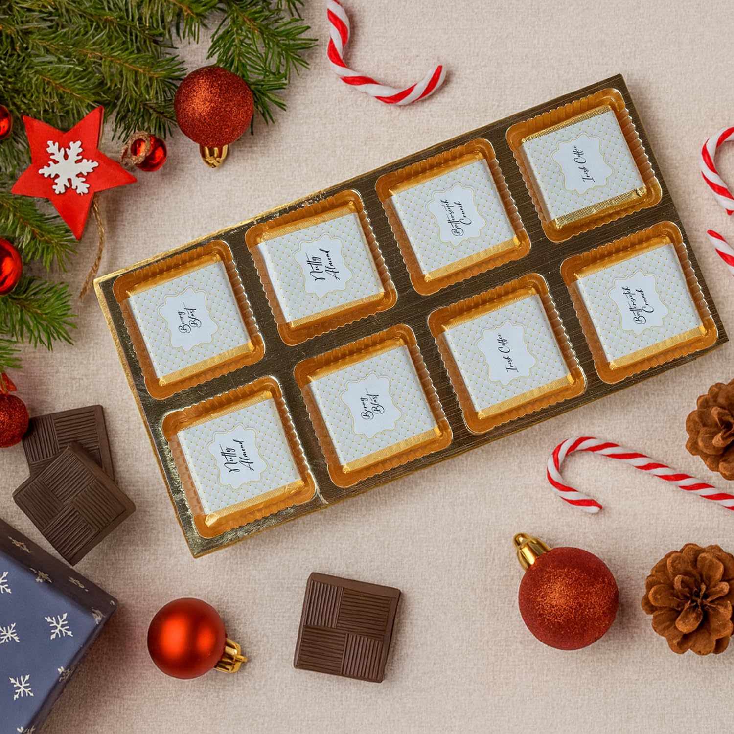 Celebrate the magic of Christmas with Cocolatey’s Premium Christmas Chocolate Gift Box, a festive delight crafted to make your loved ones feel special. This beautifully curated Xmas hamper includes 8 gourmet chocolates in 4 exotic flavours—Coffee, Nutty Almonds, Crunchy Butterscotch and Berry Blast—perfectly packed inside a luxurious gold-foiled festive box. Each chocolate is crafted to deliver a rich, indulgent bite that makes celebrations sweeter. Whether you’re gifting family, kids, friends, colleagues, or sending a surprise Christmas treat, this elegant gift box paired with a premium Christmas greeting card is the perfect way to spread joy, love and festive cheer. Thoughtfully designed for Christmas gifting, parties, Secret Santa exchanges, corporate gifting and holiday treats, Cocolatey ensures a delightful unboxing experience that instantly feels premium and festive. Make your Christmas gifting truly memorable with a sweet box full of happiness!
