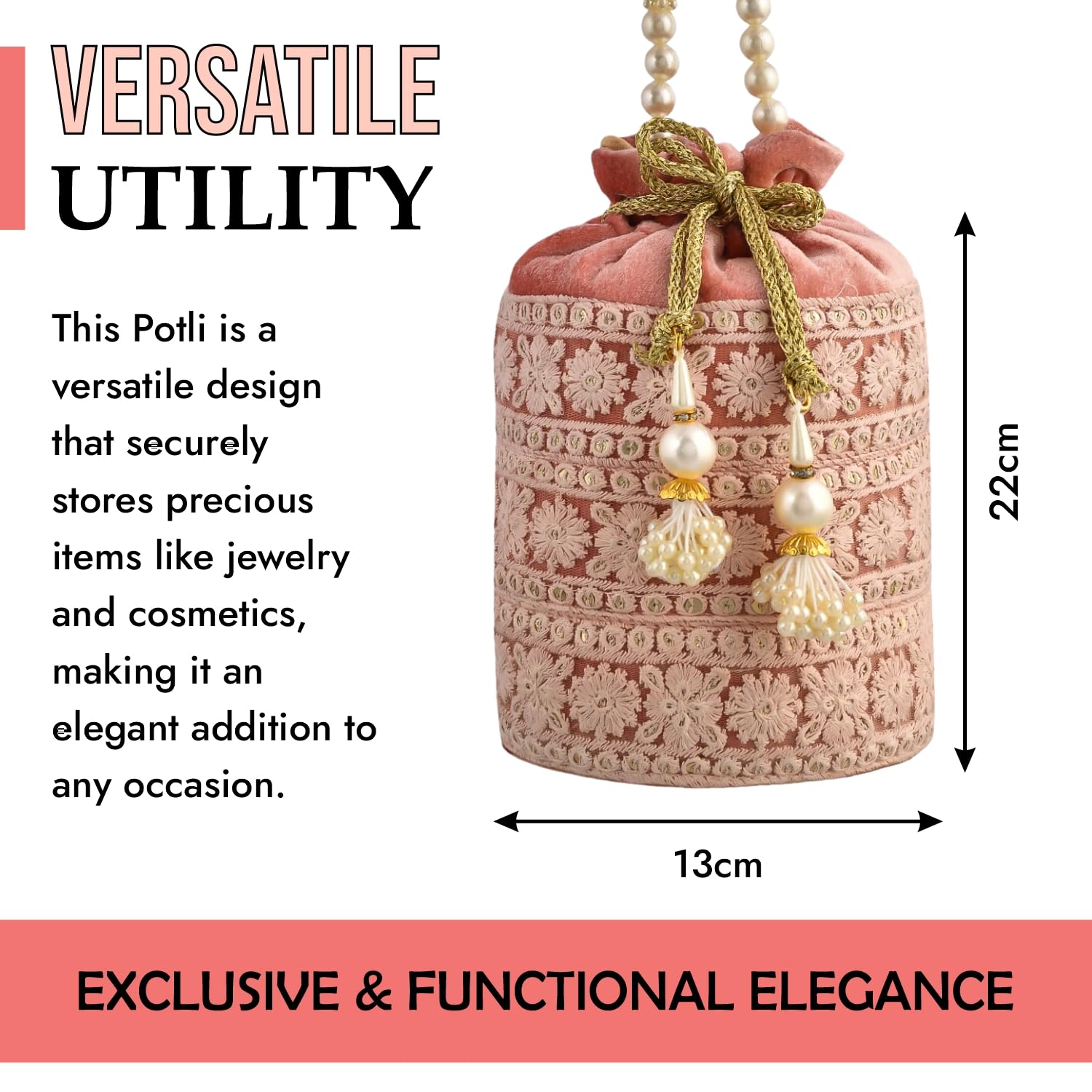 π VERSATILE UTILITY : The Potli is an Incredibly Versatile Accessory that Gracefully caters to diverse occasions. Its design versatility allows for the safekeeping of precious items like jewellery, cosmetics, Whether it’s for a wedding, Christmas celebration, or a baby shower, this Potli becomes an exquisite addition to any occasion. its elegant appearance and multifunctional nature make it a delightful choice for anyone seeking a touch of charm and practicality.