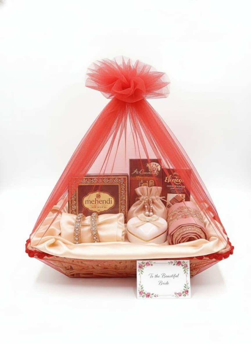STURDY WOVEN TRAY BASE: Features a durable, rectangular Woven Basket (Cream/Off-White with Pale Red Trim) that securely holds sweets, dry fruits, chocolates, cosmetics, or return gifts. Its robust structure ensures contents stay protected during transport.