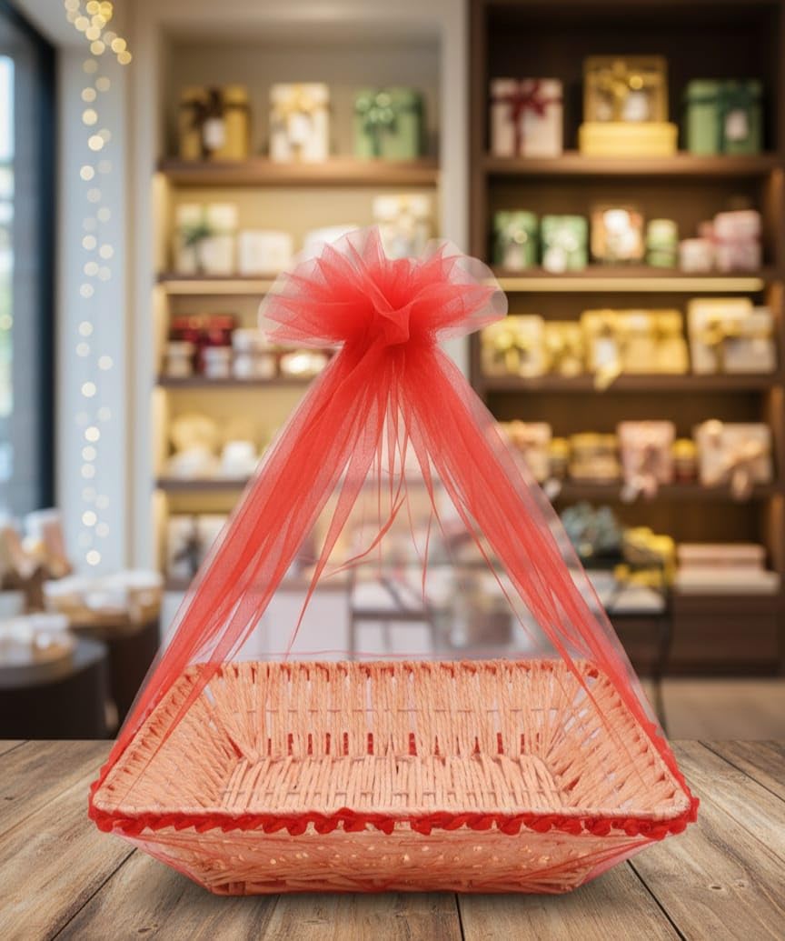 Material: Durable Bamboo material (e.g., Paper Rope, Wicker-Look) & soft Tulle fabric. Color: Cream/Off-White Basket with Pale Red Trim and Tulle Cover.Dimensions: 14 inches (L) x 10 inches (W) x 4 inches (H). Shape: Square/Rectangular base with slightly rounded corners. Package Includes: 1 x bamboo Basket, 1 x Attached Red Tulle Dome Drawstring Cover.