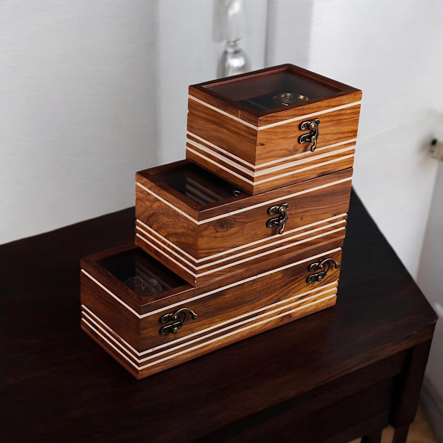 ✔️ Handmade in India by Artisans. Please refer to the dimensions before buying. Product dimension.. length =26 cm, breadth =12 cm, height = 8 cm Slot dimension = length = 7.2 cm , breadth = 7.2 cm, Depth = 6.8 cm. Material used = Lasting Indian Rosewood, Glass, Brass lock, Premium Handmade Cusions.