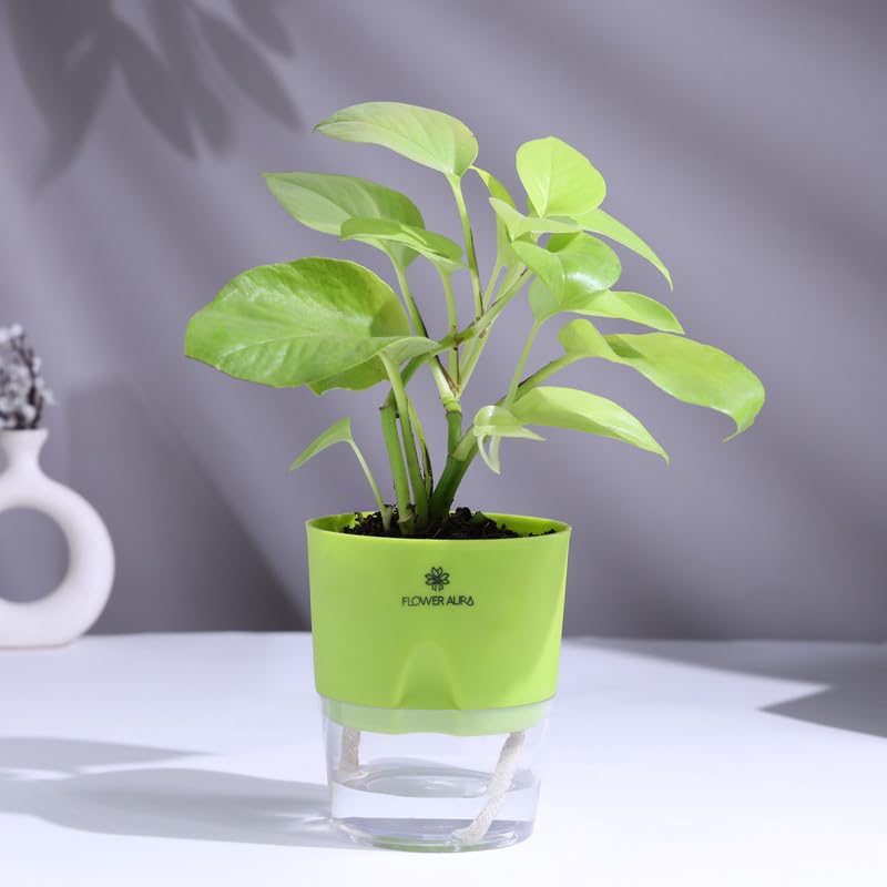 Elevate your home or office décor with FlowerAura Premium Air Purify Live Money Plant in Self-Watering Pot with Scented Oil Burner — a perfect fusion of elegance, functionality, and wellness. This thoughtfully curated gift combines the lush greenery of the Money Plant, the convenience of a self-watering pot, and the calming aroma of a scented oil burner, making it ideal for gifting or personal décor. The Money Plant (Pothos/Devil’s Ivy) is widely admired for its air-purifying properties and auspicious symbolism. It naturally filters indoor toxins like formaldehyde, benzene, and carbon monoxide, creating a cleaner, healthier environment. Its glossy green leaves are not only visually appealing but are also believed to attract wealth, positivity, and good energy, making it a meaningful addition to homes, offices, or workspaces. Housed in a self-watering pot, the Money Plant thrives with minimal maintenance. The innovative design ensures optimal water absorption, promoting healthy growth while reducing the effort required to care for it. The sleek pot complements modern, contemporary, and minimalist décor, making it a stylish centerpiece for any space. Paired with this greenery is a premium scented oil burner, filling your surroundings with soothing fragrance and creating a calming ambiance. Together, the Money Plant and oil burner make an ideal gift for loved ones, colleagues, or friends, perfectly blending nature, wellness, and aesthetics.