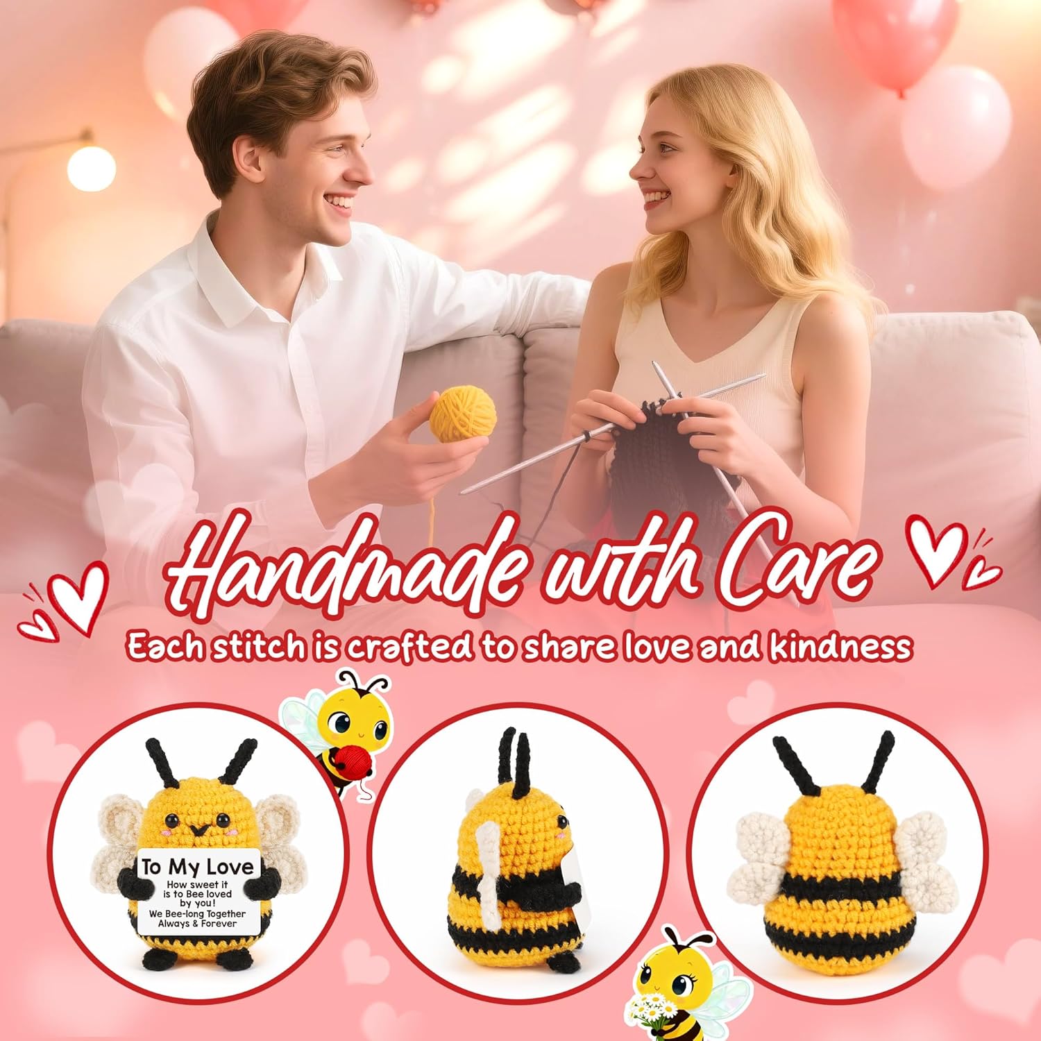 Romantic Valentines Day Gifts for Her: To my love, how sweet it is to bee loved by you! We Bee-long Together always & Forever; This cute, mini, funny, unique, and soft handmade crochet bee is perfect for wife, girlfriend, mom, grandma, sister, friends, bestie, bff, husband, boyfriend on valentines day, birthday, graduation, wedding, etc