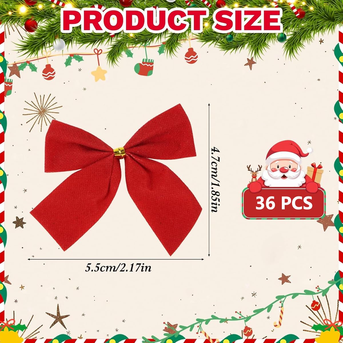 Infuse your holiday season with classic red charm using the 36PCS Red Christmas Bows—a versatile set of decorative bows designed to elevate every corner of your festive space. Crafted from high-quality polyester, each bow features a rich, vibrant red hue (the iconic color of Christmas) and a pre-shaped, full-bodied design that’s ready to use right out of the package. With 36 bows in one set, you’ll have ample supply to adorn Christmas trees, wrap gifts, decorate mantels, or add flair to holiday parties—no need to skimp on style. Durable enough to reuse for years and easy to attach to any surface, these bows blend timeless holiday aesthetics with practicality, making them a must-have for Christmas enthusiasts, crafters, and anyone looking to make their holidays brighter.