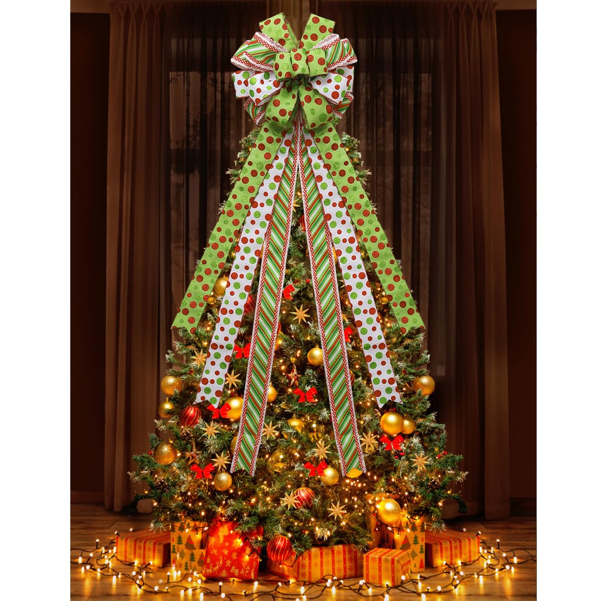 【Quality Material】High quality material-Handmade red green dot polyester gift bow, use it on top of your Christmas tree,window,door,perfect for your Christmas party.