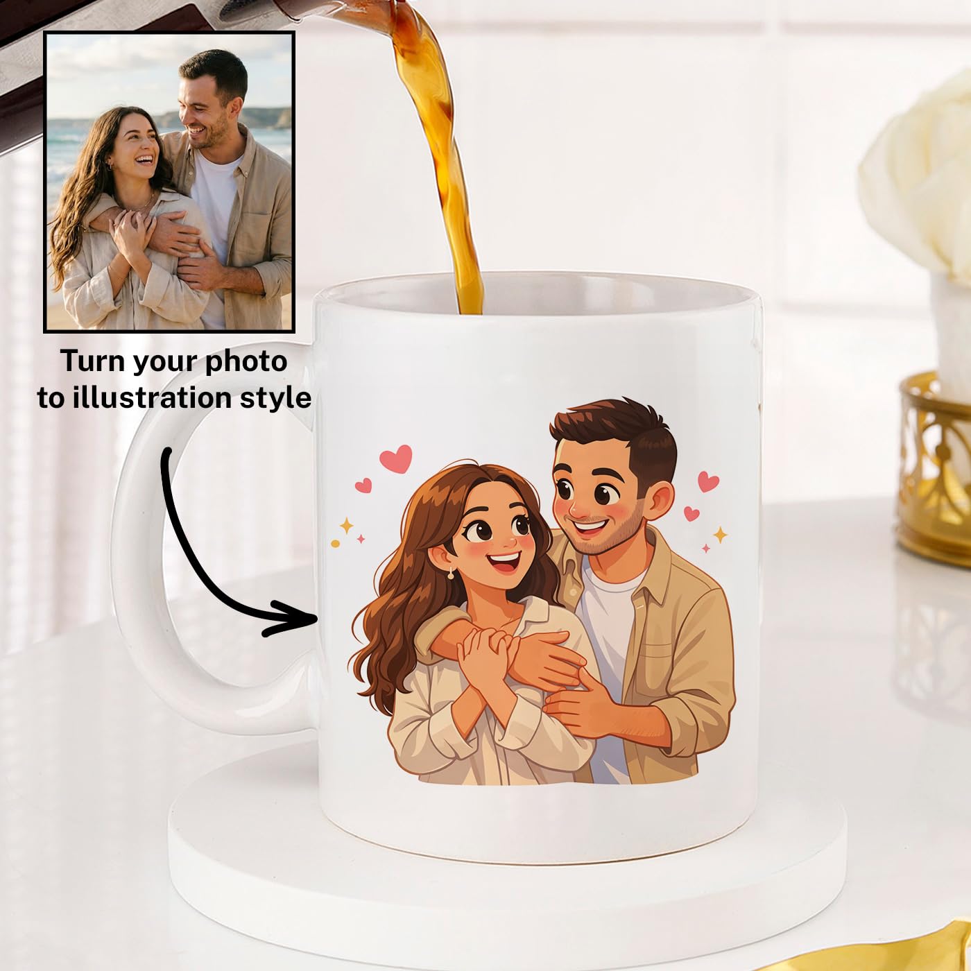 Create a one-of-a-kind gift with this Personalized Photo to Cartoon Mug. Turn your favorite couple photo into a beautiful cartoon illustration printed on a premium 11oz ceramic mug. Our talented artists carefully transform your image into a charming and romantic artwork. This custom mug is the perfect gift for: Anniversary Valentine’s Day Wedding Engagement Birthday Christmas Couples Gift Each mug is made from high-quality ceramic and printed with vibrant, long-lasting colors. PRODUCT FEATURES: Size: 11oz Material: Premium white ceramic Microwave safe Dishwasher safe Permanent, high-quality print Custom made just for you This personalized cartoon mug is more than just a cup — it’s a meaningful memory that will last forever. Order now and turn your photo into a beautiful custom illustration.