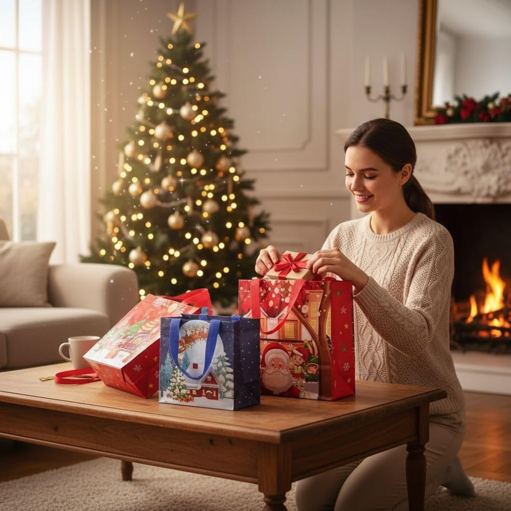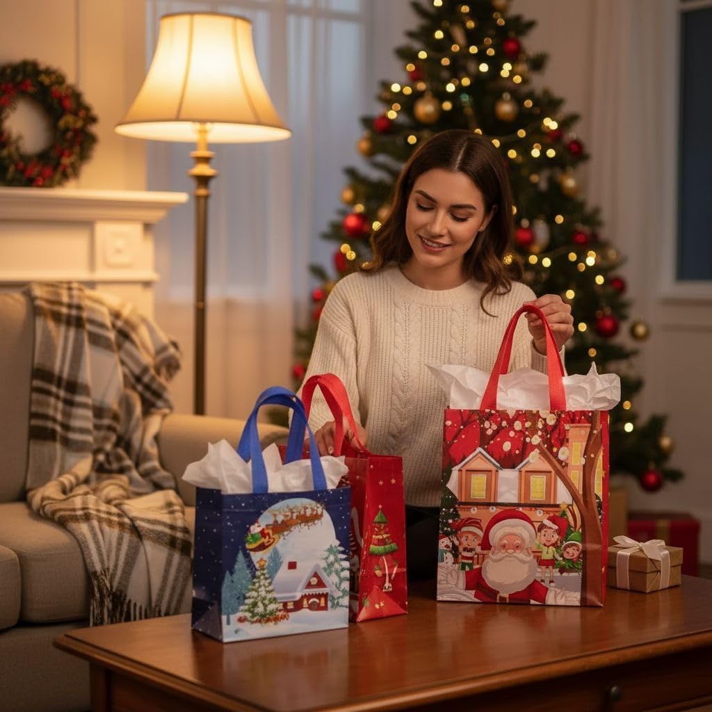 β[Stylish & Christmas Designs]: Elevate your holiday gift-giving and turn heads with these beautifully designed bags at Christmas parties and family gatherings. Our christmas bags for gifts boasting 4 charming holiday patterns, including Santa claus, christmas tree, snowman, christmas lights, “Merry Christmas” and vailable in a range of appearances and styles.