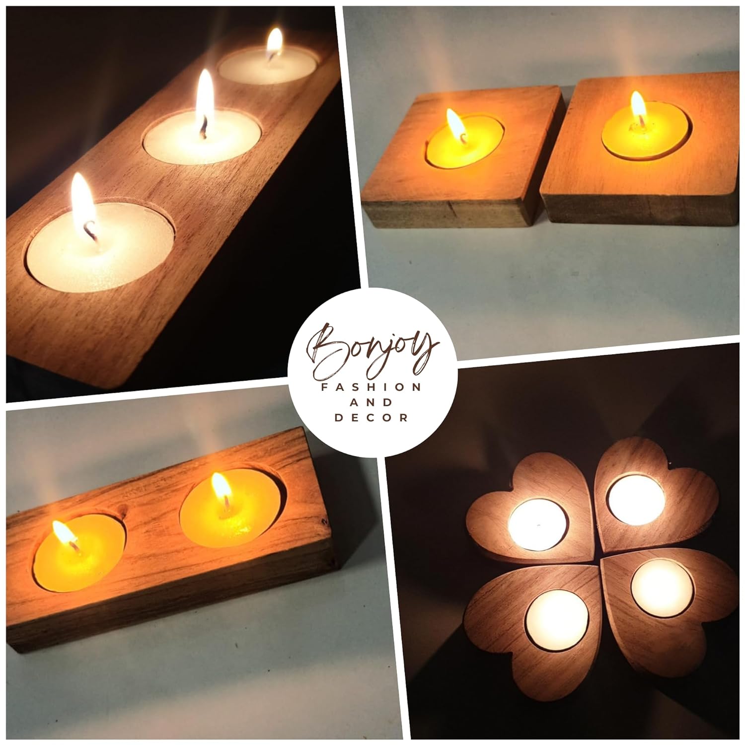 Handmade Rectangular Wooden Tealight Candle Stand – Acacia Wood Bonjoy Fashion and Decor presents our Handmade Rectangular Tealight Candle Holder Stand. Crafted from high-quality acacia wood, this wooden candle holder holds three tealight candles, perfect for home, office, or restaurant decor, and ideal for gifting to friends, family, and corporate clients. Unique Design and Versatile Decor Our wooden candle stand’s unique rectangular design complements any home décor. Whether on a dining table, coffee table, or wall shelf, this hand-finished candle holder adds elegance and charm. Durable and Naturally Beautiful Made from durable acacia wood, each candle stand is hand-polished to highlight the wood’s natural grains and textures, bringing a touch of nature into your home. Candle Holder Decoration Ideas Dining and Coffee Tables: Enhance your dining or coffee table decor with this rectangular wooden candle holder. Wall Shelves: Add a warm ambiance to any room by placing the candle holder on wall shelves. Outdoor Relaxation: Use the candle stand outdoors with colorful tealight candles for a relaxed atmosphere. Gift Ideas: Perfect as a gift for friends, family, and loved ones on special occasions. Festivals and Celebrations: Ideal for Diwali, Christmas, New Year, and anniversaries, making a stunning centerpiece with flowers and petals. Special Occasions: Beautify spaces for weddings, birthdays, Valentine’s Day, and more. Home Decoration Accessories: Perfect for bedrooms, bathrooms, dining tables, living rooms, entrances, and hallways. Enhance decor by placing it near entrances or in sitting areas. Creative Decor: Discover endless creative ways to use this candle stand for home decoration. This handcrafted tealight candle holder is a versatile and stylish addition to any home decor collection. Order your Handmade Rectangular Wooden Tealight Candle Holder today and elevate your home decor with the natural beauty of acacia wood!