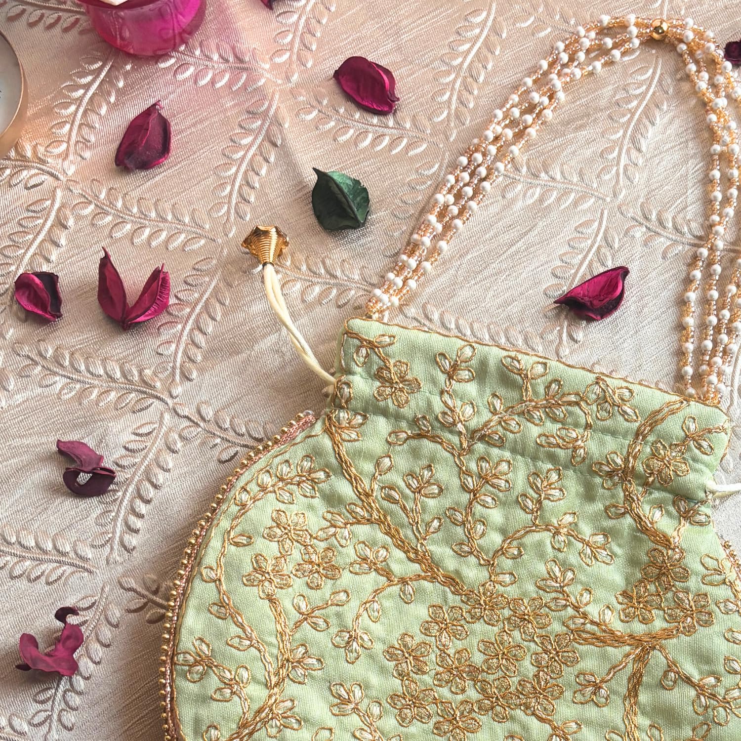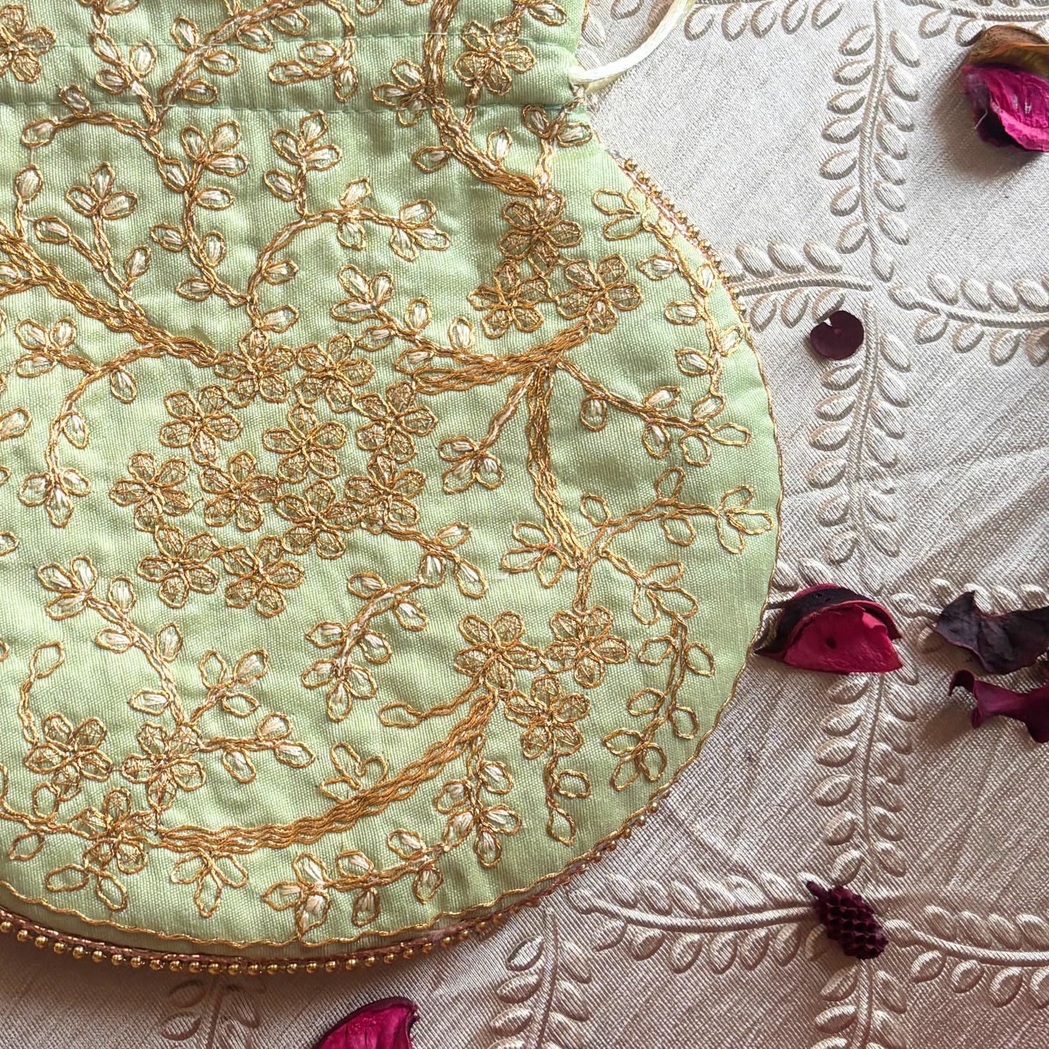 Elevate your wedding, festival, or casual ensemble with this Gorgeous Embroidered Potli Bag – a truly unique piece designed to make you stand out at every occasion. Handcrafted by skilled artisans from Rajasthan, this Potli (or Batwa) bag is a beautiful fusion of rich tradition and modern luxury. Made from premium silk and satin material, it features exquisite gold embroidery that adds a radiant, luxurious touch to your look. Whether you’re attending a wedding, party, or festival, this Potli bag complements your style with its eye-catching design and timeless elegance. With a braid string closure, this bag is not only easy to carry but also keeps your valuables secure. It’s the perfect size to hold your smartphone, money, cosmetics, jewelry, and other essentials, making it the perfect blend of fashion and functionality. This versatile bag can be used in multiple ways – as a clutch, handbag, or a gift bag for weddings, festivals, Valentine’s Day, or other special occasions. It makes for a thoughtful gift for loved ones and is ideal for use as a return gift at weddings, festivals like Diwali and Rakhi, or even Mother’s Day and Sister’s Day. Handmade with love, no two pieces are identical, meaning slight variations in design, color, and shape are a part of the unique charm and craftsmanship. This bag is not just an accessory – it’s a statement of heritage, elegance, and celebration. Key Features: Premium Silk and Satin Fabric with luxurious gold embroidery for a rich, traditional look. Perfect for Weddings, Parties, Festivals, and Casual Wear – Ideal for any occasion. Spacious Design – Holds mobile phones, cosmetics, jewelry, and other essentials. Versatile Use – Can be worn as a clutch, handbag, or decorative gift bag. Handcrafted & Unique – Slight variations in design, color, and pattern are part of its charm. Thoughtful Gift Idea – Perfect for gifting on special occasions like Diwali, Rakhi, Valentine’s Day, and more.