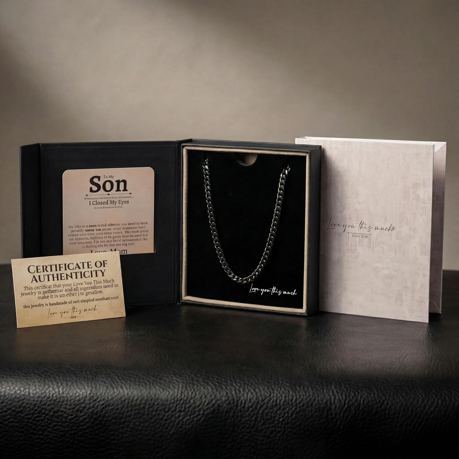 A Timeless Gift for a Son from Mom Celebrate the incredible bond between mother and son with this classic Cuban link necklace. Thoughtfully designed as the perfect gift for son from mom, this piece is more than just jewelry, it’s a lasting reminder of her love, pride, and unwavering support. Crafted from premium, surgical-grade stainless steel, this 5mm Cuban link necklace is hypoallergenic, waterproof, sweatproof, and chemical-proof, built to keep up with him through every stage of life. The 22″ length makes it a bold, stylish statement he can wear every day. Presented in a luxury gift box and paired with a touching message card that reads: “To My Son: When you wear this necklace, always remember… I closed my eyes for a moment and suddenly a man stood where a b*y used to be. I may not carry you in my arms anymore, but I will always carry you in my heart. You have given me so many reasons to be proud of the man you have become. But the proudest moment for me is telling others you are my son. Love, Mom.” Whether it’s for a birthday, graduation, milestone achievement, or just because, this necklace is the ultimate mother to son gift to celebrate his journey and the man he’s become.