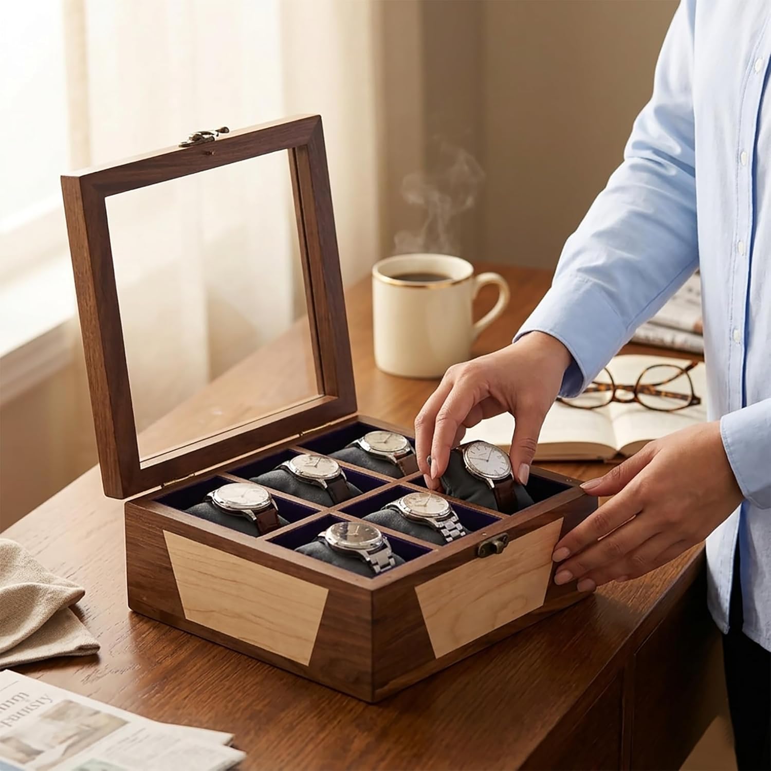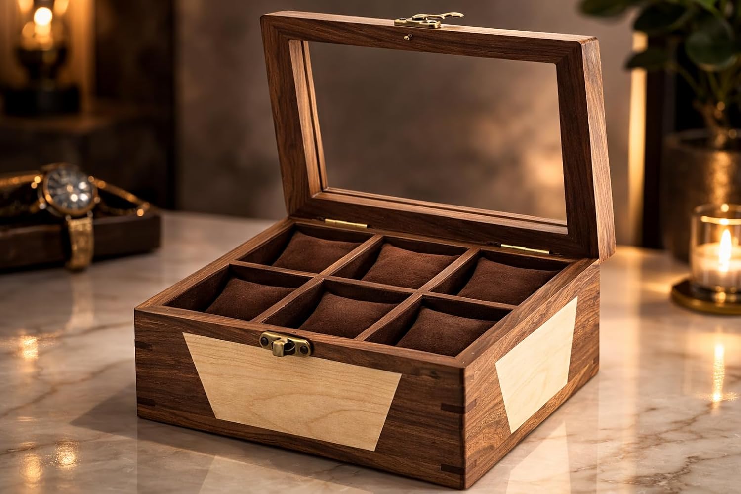 Elevate your watch collection with this exquisite handcrafted wooden watch box, expertly crafted from premium walnut and maple wood. Featuring a stunning glass lid, this 6-slot watch storage case lets you admire your treasured timepieces even when the box is closed. The rich contrast of walnut and maple creates a visually striking design that looks equally impressive on a bedroom dresser or office desk. Each slot is lined with soft cushioning to keep your watches safe and scratch-free. The brass latch closure adds a touch of vintage elegance, making this box as functional as it is beautiful. Whether you are looking for a thoughtful anniversary gift for your husband or boyfriend, a memorable groomsmen gift, or a special Christmas present for him, this premium watch display case is a truly inspired choice. It also makes a wonderful gift for fathers who appreciate fine craftsmanship. Organise your collection in style and give your watches the home they deserve.