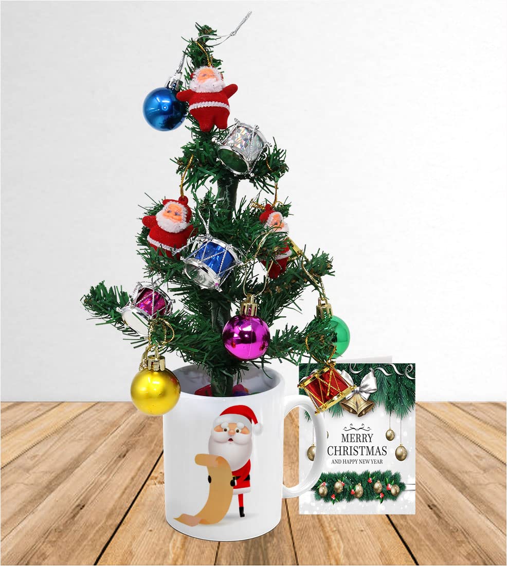 Package Content: 1 Printed Mug (11 Oz., 325 ml Capacity), 1 Christmas Tree, 10 Pcs Christmas ornaments Mix,1 Christmas Wishes Greeting Card,